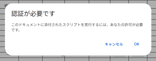 作成したスプレッドシートやGoogleドキュメント等で初めてGASを使用する際、最初の一回目に限り、以下の画像のようなポップアップがでます。