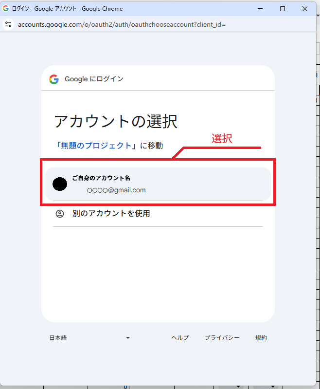 表示されたアカウント内に、目的のアカウントが表示されていない場合、まずは目的のアカウントにログインしてからScriptを再実行し、再度このページまで戻ってきてください。