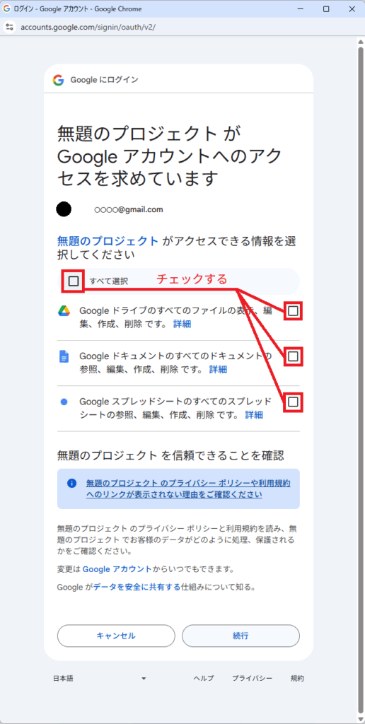 そのプロジェクト(スクリプト)に、どこまでの権限を持たせるのか。を選択するページが表示されます。